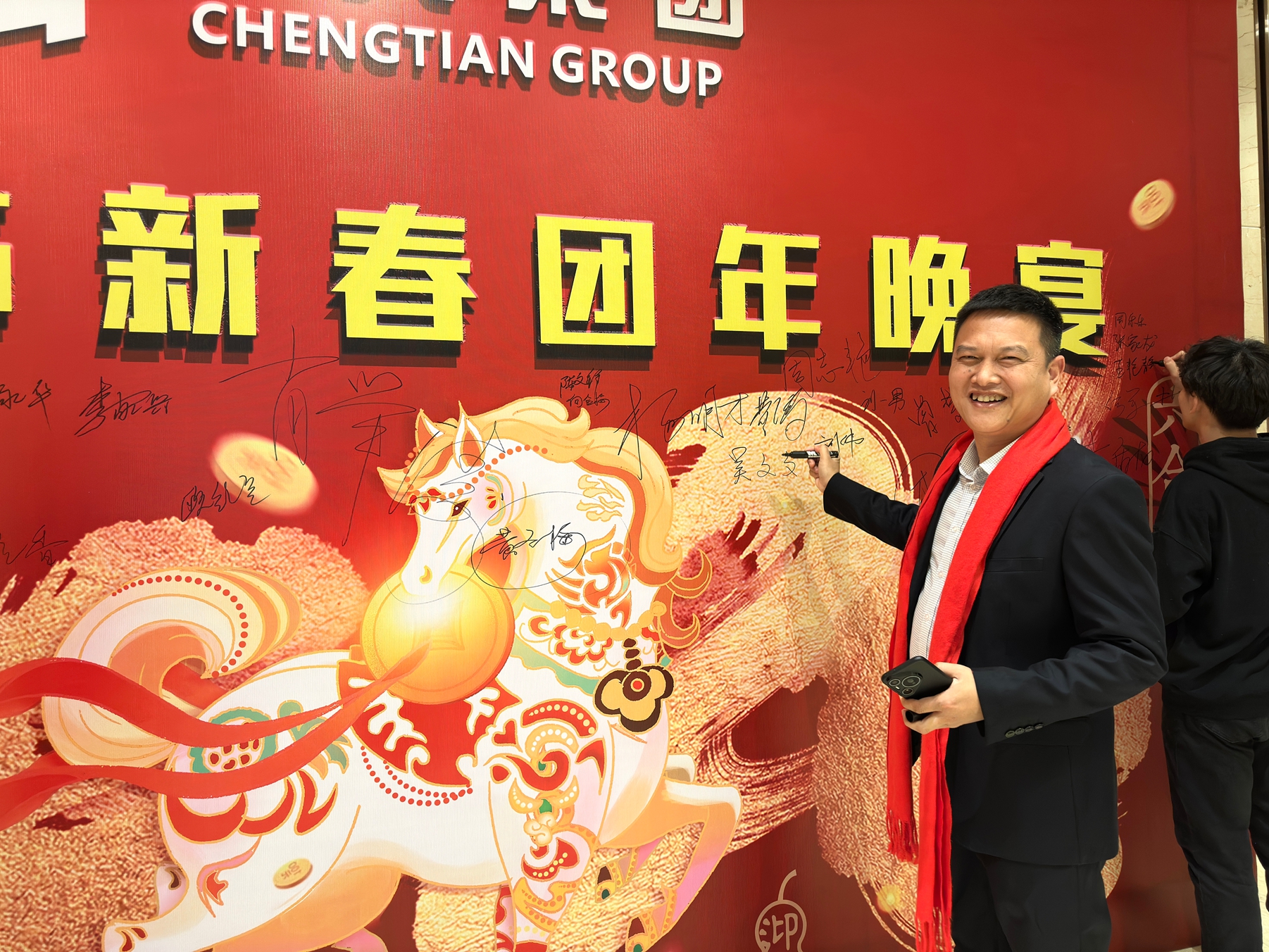 年會尚未正式開始,簽到墻上已落滿深情。金色記號筆在背景板上一筆一畫游走,有人龍飛鳳舞簽下姓名,轉身招呼部門伙伴合影,有人工工整整寫下名字,笑著比出大拇指。